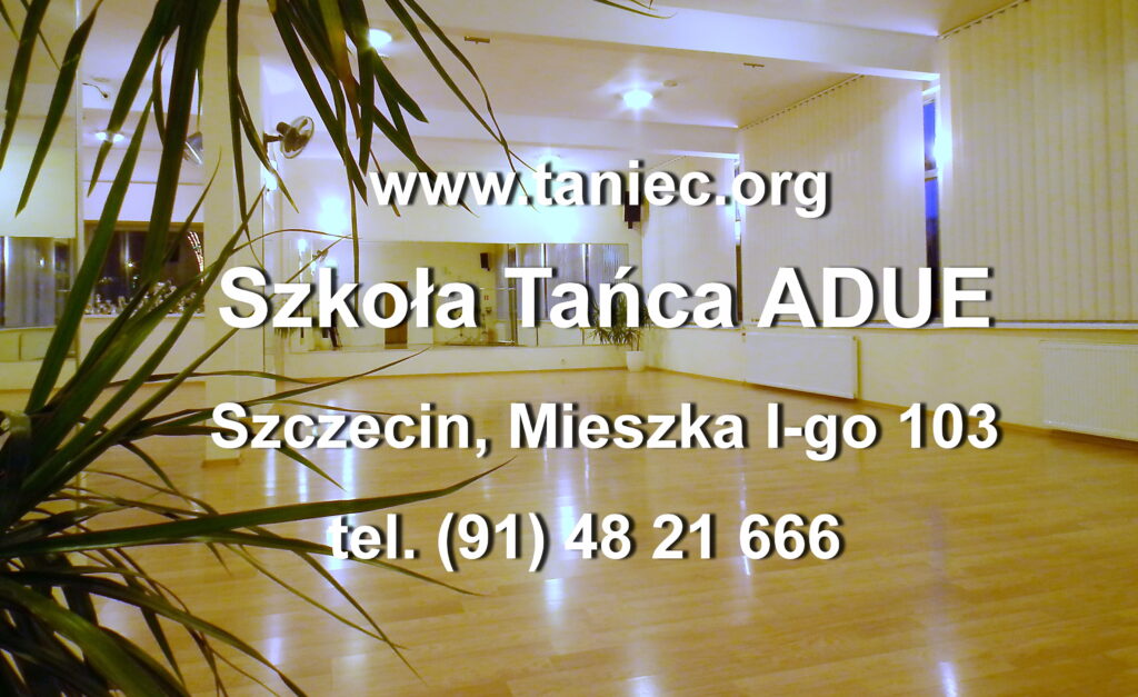 KONTAKT SZKOŁA TAŃCA ADUERomuald RychcickiSzczecin, ul. Mieszka I-go 103plac Szyrockiego,skrzyżowanie: Piastów, Mieszka I-go i Powstańców Wlkp.tel. 91-48-21-666e-mail : biuro@taniec.org